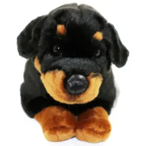 Adopt the Uni Toys 22811A-RW Rottweiler Black and Brown 45cm Lying Plush Toy – a solid, cuddly companion ready for long, cosy snuggles.