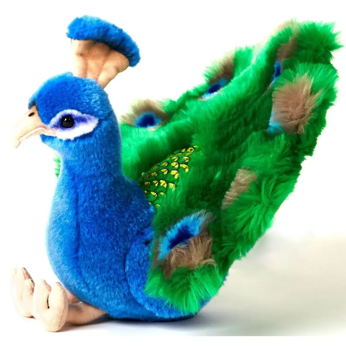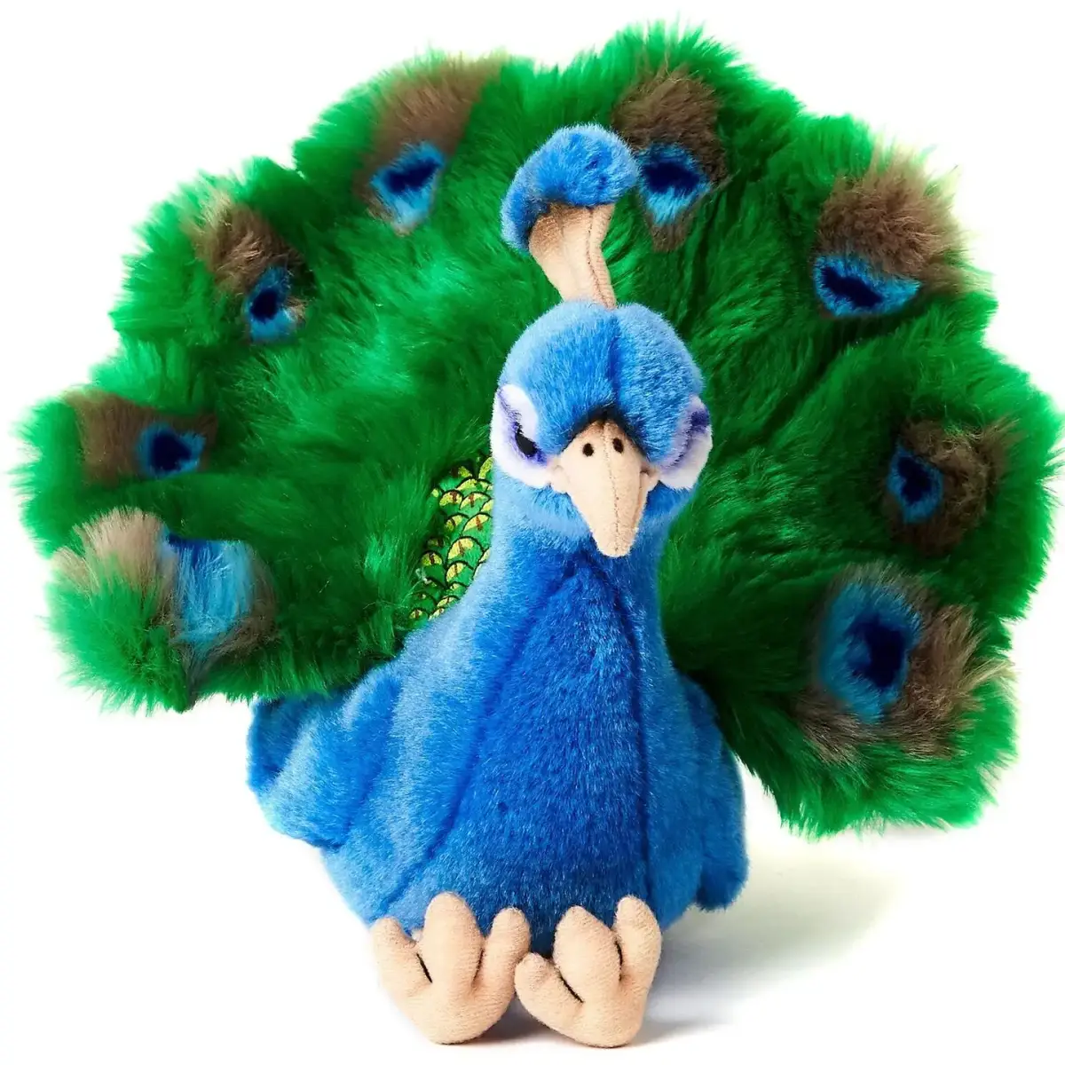 Design: Blue and green peacock plush with colourful detailing