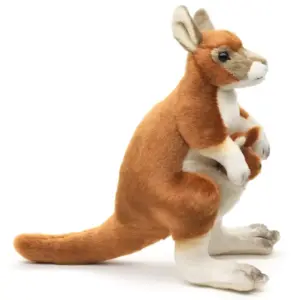 Bring a piece of the Australian outback home with the Uni Toys F91933R7 Kangaroo with Baby in Pouch Plush Soft Toy. Measuring 23cm, this charming kangaroo is crafted from soft brown plush with a cream belly, upright ears, and a lifelike standing pose – complete with a tiny joey peeking out of its pouch.