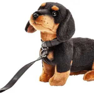 This version includes a leash, making it perfect for imaginative play as children take their dachshund for walks and adventures. Made from premium plush fabric and filled with huggable stuffing, this pup is both cuddly and durable – great for playtime or display.