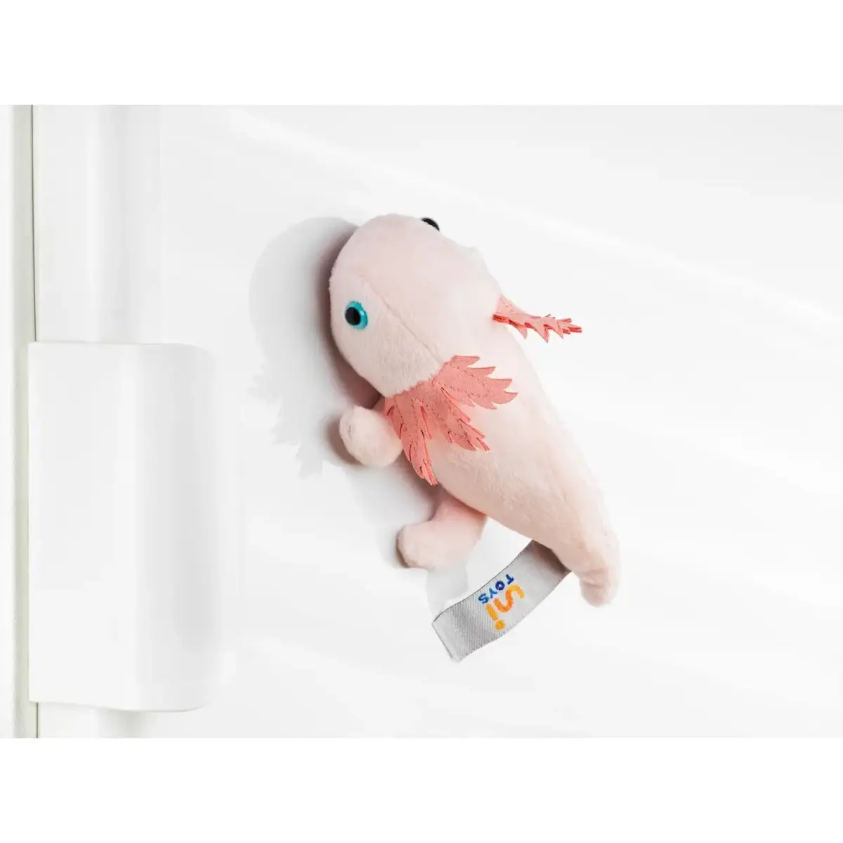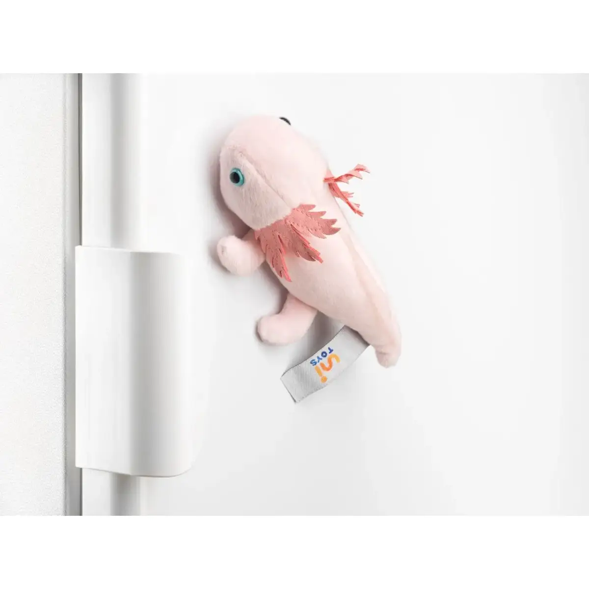 Hidden safely inside the belly is a small sewn-in magnet (not loose or removable). This allows the axolotl to gently cling to magnetic surfaces, such as a fridge, notice board, or locker, adding a playful and decorative element while remaining a soft plush toy.