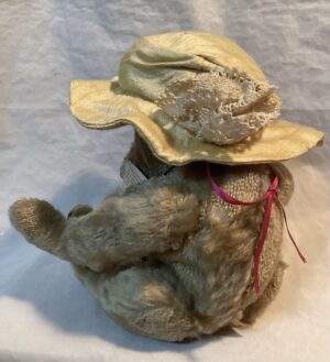 This vintage Norberry Bear is made using a beige mohair fur and suede paw pads in a matching colour. She is wearing a satin hat in an antuiqued yellow hue and has a pink ribbon with a bell on attached around her neck. She is part stuffed and has a bean filled belly, which makes her floppy and squishy. The Norberry Bear is fully jointed and her head can be posed but is usually facing down due to her floppy body and solid stuffed head.