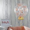 This confetti balloon is a gorgeous decoration to please any bride and groom! Available in a range of different colours to suit your chosen theme, this balloon would make an elegant addition to any special day. We inflate a 20″ spherical clear plastic balloon and then insert confetti; to finish we add 4 small balloons to the base of the balloon and add colour co-ordinated ribbons and weight.