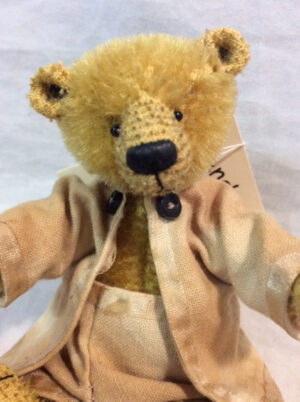 Alfie is a 10 cm / 4" fully jointed miniature ooak bear. He has been sewn from a luxurious, short-pile yellow mohair with coordinating cotton backings, plus plucked mohair palms, and matching smooth soles, whilst being lovingly stuffed, with poly fibre and steel shot for weight. He has glossy black eyes that shimmer out above his plucked snout, which is home to his expressive, hand stitched black nose and mouth. His wee cupped ears and thread claws add that touch of charm and character, plus a hand dyed jacket and shorts, trimmed with satin ribbon and two buttons at the collar, complete his captivating look.