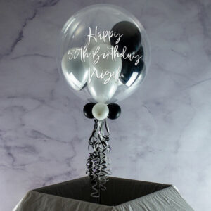 Celebrate in style with our fantastic black and white themed balloon package, great for birthdays, anniversaries and other special occasions. Comprising of a range of balloons in different shapes and sizes, all with a black and white theme, this package makes the perfect decoration for casino nights, James Bond parties and other suave events. Our package includes: 1 x black & white filled personalised inflated bubble balloon, 2 x black and white circle inflated foil balloon bunches, 10 x inflated small black & white scatter balloons, Our foil balloons have a float time of 7-10 days, please ensure they are kept in a room temperature environment as helium balloons can appear to deflate in colder temperatures.
