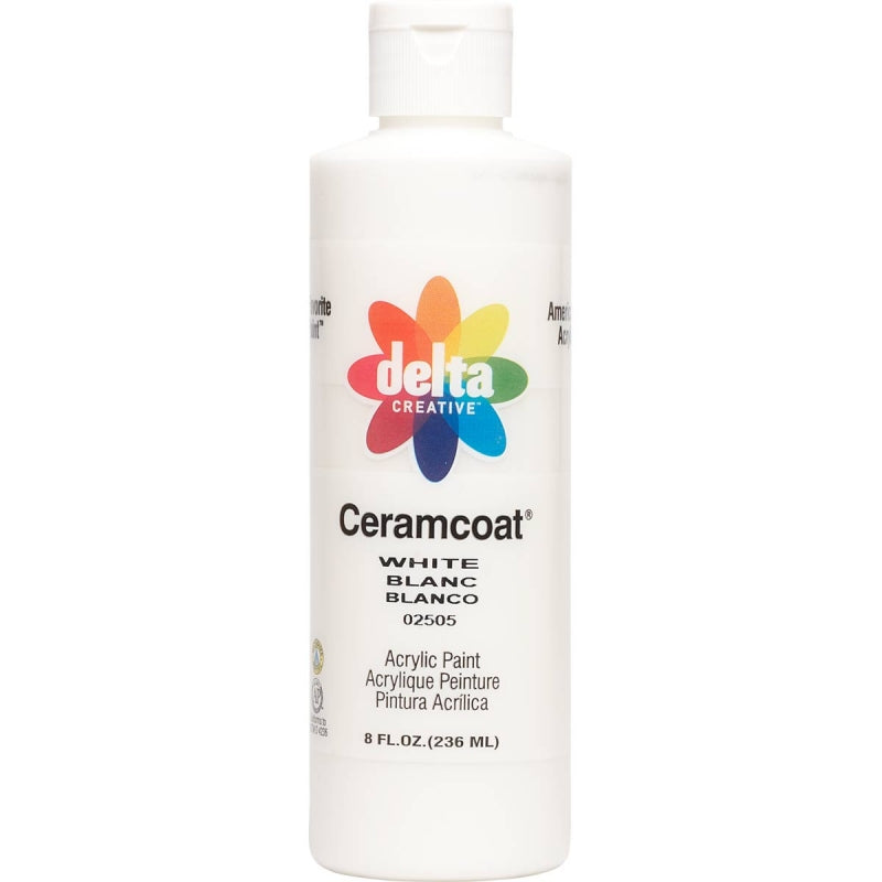White Delta Ceramcoat 8oz from World of Craft. Delta Ceramcoat Acrylic Paint is an all-purpose, premium quality acrylic paint formulated specifically for the decorative painter and craft enthusiast. Its rich and creamy formula provides excellent coverage and consistent color on all porous surface such as wood, terracotta, plaster, and paper mache and dries to a beautiful matte finish. All colors are water-based and non-toxic, making cleanup easy with soap and water.